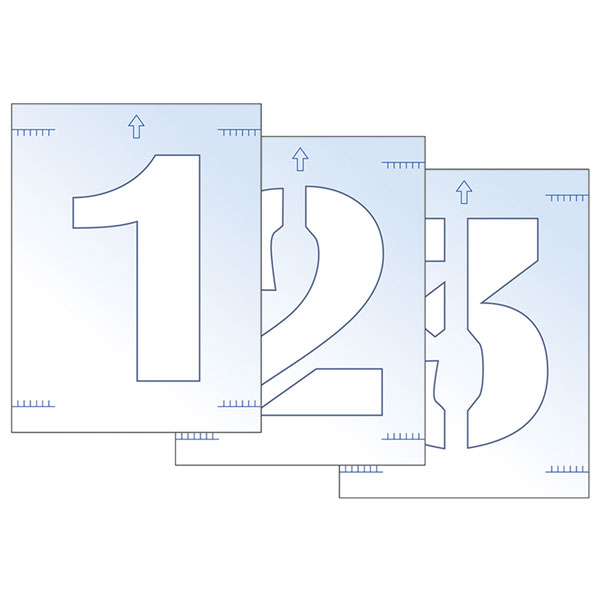 The stencils have letters and/or numbers with identical heights, with varying widths per individual character. The spacer marks in the corners of the stencils allow the user to accurately line up the next character in sequence, ensuring neatness.