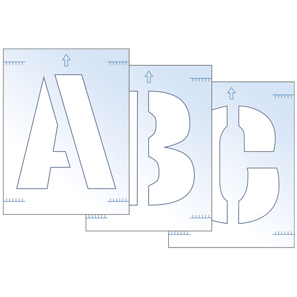 The stencils have letters and/or numbers with identical heights, with varying widths per individual character. The spacer marks in the corners of the stencils allow the user to accurately line up the next character in sequence, ensuring neatness.