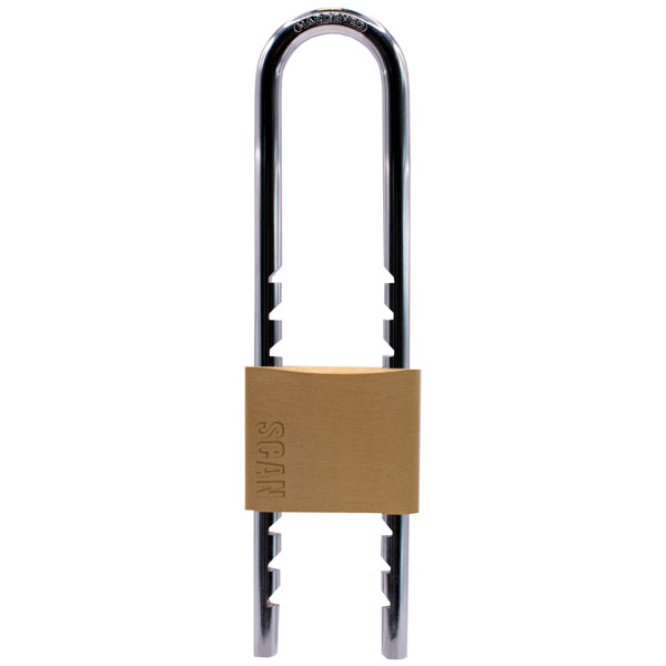 This Scan Brass Padlock has a sliding shackle with double locking tongues for improved security and the flexibility to be locked in a variety of positions to suit the application.