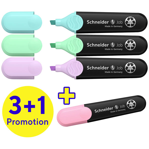 Schneider Electric, Manufacturer's Part Number 115074, represents the Textmarker Job pastel set, a collection of four assorted pastel highlighters designed for precision and clarity in various marking applications. This set, referenced alternately as 3385622, incorporates a specially formulated ink that provides smooth, consistent coverage without smudging or bleed-through, making it ideal for technical documentation, drafting, and design annotations. The pastel shades offer a subtle contrast that is less straining on the eyes, enhancing readability while ensuring important information is easily distinguishable. Housed in durable blue plastic, each highlighter measures 15 cm in length, offering comfortable handling during extended use in engineering environments, including specification marking or error correction. The set also includes a 3+1 action, which is beneficial for users requiring multiple highlighters for varied tasks.