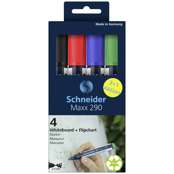 Schneider Electric 129084, is a set of blue plastic medium tip markers, specifically the Whiteboard-Marker Maxx 290 4er Etui, offered in a 3+1 assortment pack. These markers are engineered for precise writing on whiteboards, featuring an ergonomically designed medium tip that provides a consistent and smooth ink flow, ensuring clarity and legibility in professional presentations and collaborative engineering environments. The markers are housed in durable plastic casings to withstand frequent use, making them ideal for demanding applications such as detailed engineering project planning, schematic diagram updates, and error corrections during technical meetings. The set's design supports efficient ink distribution, which is crucial for maintaining the longevity and reliability required in technical and educational settings.