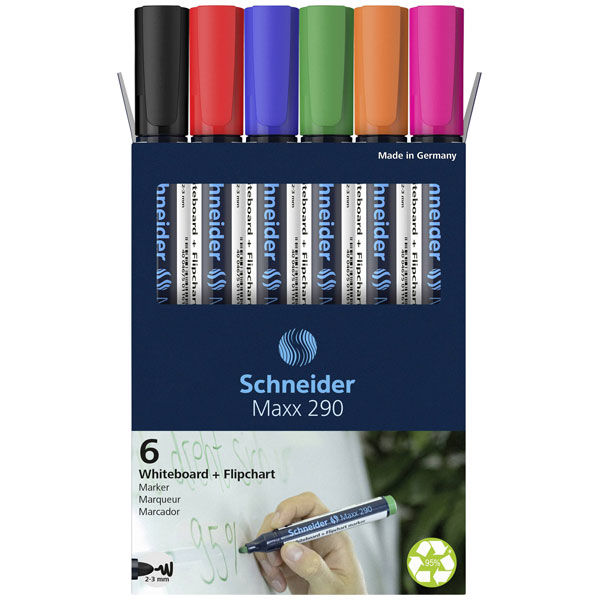 Schneider Electric 129096 refers to the Whiteboard-Marker Maxx 290 6er Set, which is a collection of writing instruments designed for precision and versatility in marker applications. This set includes six assorted colours, featuring advanced ink formulae that offer quick-drying and smudge-resistant properties, ideal for dynamic environments where reliability and clarity on whiteboards are essential. Engineered for frequent use, the markers demonstrate consistent ink flow and are suitable for a range of applications, such as presentations, workshops, and educational settings, where erasable writing surfaces are utilised. The product's design ensures long-lasting performance, making it a dependable choice for technical professionals requiring efficient, visible communication tools in their workspace.
