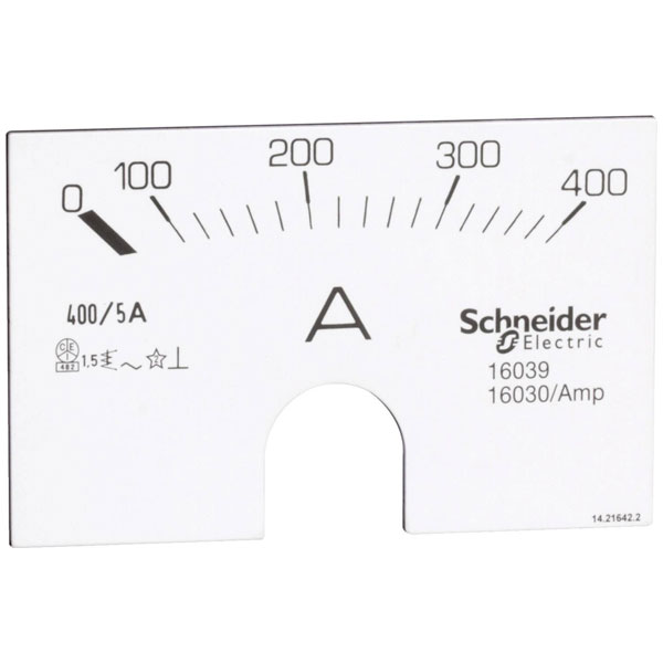 Schneider Electric's 16039 is an analogue ammeter dial designed for monitoring electric current in switchboards. It features a moving iron mechanism with a scale range of 0-400A, making it suitable for measuring alternating current. Typical applications include industrial panels and electrical installations where precise current measurement is essential.