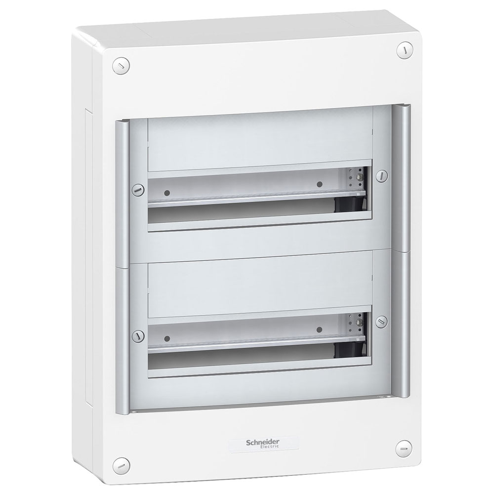 This Schneider Electric PRA20213 Pragma surface mounting distribution enclosure can house up to 26 modules in two rows of 13.