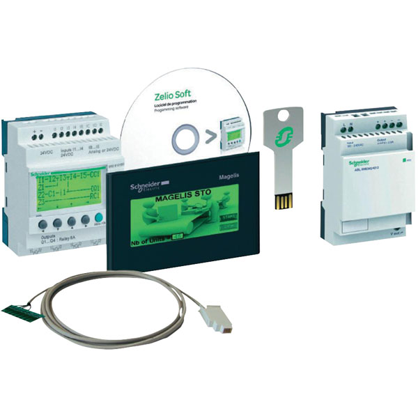 This Zelio Logic PLC starter kit contains everything required to serve as an introduction to intelligent control in modern automation. The kit consists of a Magelis operator terminal, a Zelio Logic smart relay module (see 57-8123), configuration and programming software, USB download cable, connecting cable and power supply.