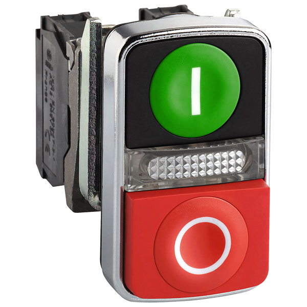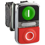 An LED illuminated green and red double-headed industrial switch from Schneider Electric's XB4BW73731 series.
