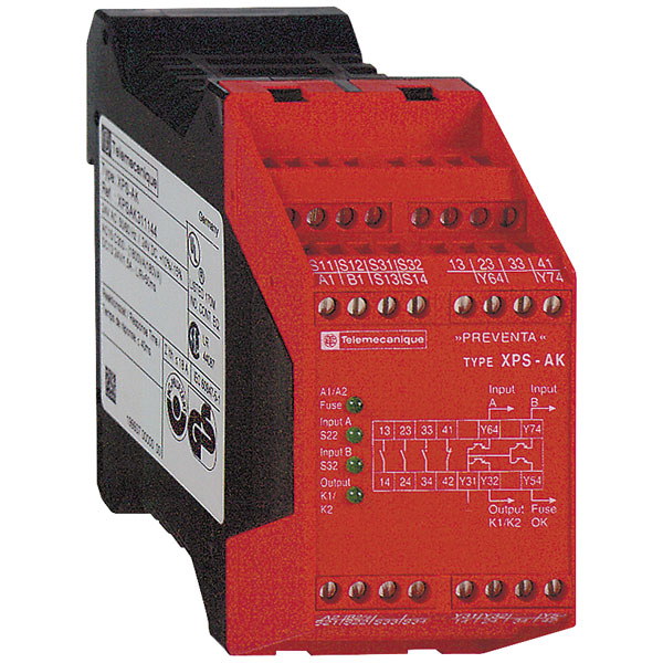 An e-stop safety relay from Schneider Electric's XPSA series.