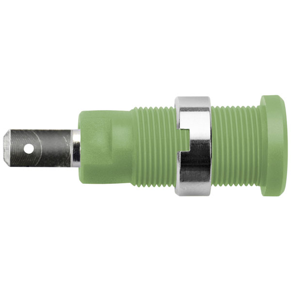 The Schützinger Safety socket is a green, 4mm jack socket used for laboratory applications. It features a robust design and safety jack socket that ensures secure connections. Ideal for use in experimental setups, it provides reliable connections and enhanced safety in electrical measurements.