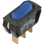 A 25A SPST rocker switch with an actuator illuminated by a blue LED.