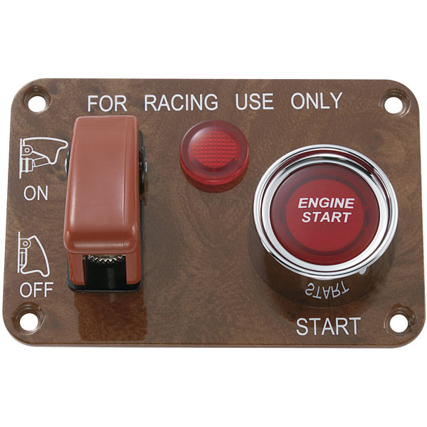 An aluminium panel fitted with a 20A on/off switch, 50A 'engine start' push button switch and an LED indicator lamp.