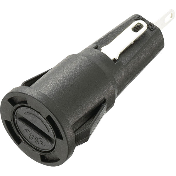 A snap-fit panel mounting fuse holder for 5 x 20mm fuses with ratings up to 6.3A.