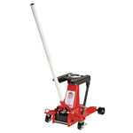Single-piece hydraulic unit with heavy base design. Integral cog-type release mechanism and long two-piece handle. Heavy-duty castors are fitted with brakes so this jack can be used as a quad/bike lift as well as a standard jack. Large saddle design to ease positioning under vehicle. Removable saddle to improve stability and safety when lifting motorcycles and quadbikes. Additional rubber gripped padding on the lifting plates increases stability. Features solid stainless steel locking pin to lock jack in raised position for prolonged use and reduce pressure on the hydraulics when at maximum height. Fitted with safety overload valve and pump through valve to prevent handle locking at maximum ram extension.