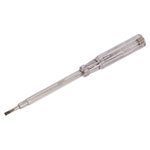 VDE Approved mains voltage tester with screwdriver blade. Fully insulated with moulded transparent plastic handle and blade sheath.