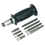 Heavy-duty 1/2"Sq drive impact driver with composite handle and integral knuckle guard. Features twist reverse for operation in either direction. Supplied with 8pc Chrome Vanadium steel driver bit set and 8mm hex drive adaptor.