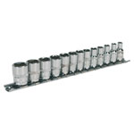 Chrome Vanadium steel sockets, hardened and tempered for added strength. Fully polished chrome finish for corrosion resistance. WallDrive® configuration giving an additional 30% more torque handling power than traditional sockets. Knurled ring for extra grip with oily fingers. Supplied with socket rail.