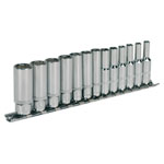 Chrome Vanadium steel sockets, hardened and tempered for added strength. Fully polished chrome finish for corrosion resistance. WallDrive® configuration giving an additional 30% more torque handling power than traditional sockets. Knurled ring for extra grip with oily fingers. Supplied with socket rail.