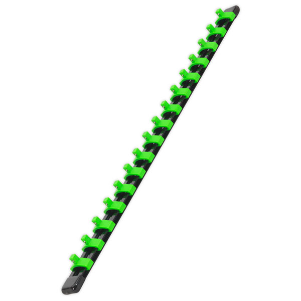 Aluminium socket rail with hi-vis green nylon clips. Holds up to 16 x 1/4"Sq drive sockets.