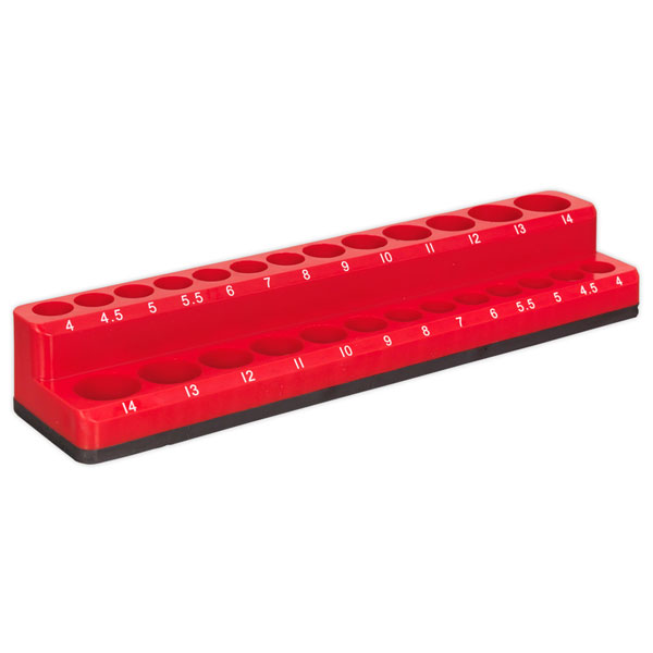 Durable, high impact ABS socket holder with strong magnetic backing. Holds up to 13 standard and 13 deep 1/4"Sq drive sockets up to 14mm. Ideal for use in tool chest drawers or can be attached to any ferrous surface. Allows you to maintain a tidy workstation with sockets always to hand.