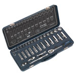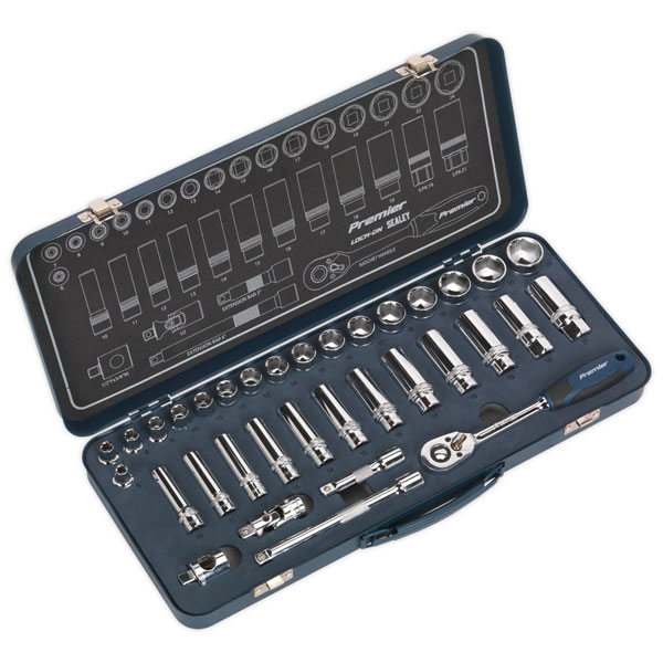 Heat treated, drop-forged Chrome Vanadium 6142 steel sockets and accessories with a fully polished mirror finish. Features specially machined flutes in the walls of the socket which enable use on up to 85% rounded fasteners. This not only provides added strength but also prevents damage to worn or rusted fixings. Standard sockets cover sizes from 6 to 24mm and deep sockets from 10 to 19mm. Features 48-tooth gear-to-gear flip reverse comfort grip ratchet wrench with push-button quick release, extension bars, spark plug sockets, universal joint and 1/2"Sq Drive - 3/8"Sq Drive Male Adaptor. Includes contents map displayed inside the lid. Supplied in metal storage case.