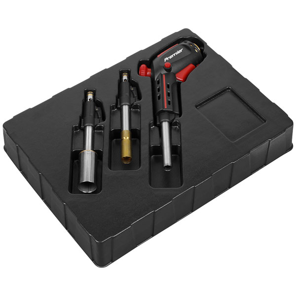 Supplied with three interchangeable heads: pin-point flame, soft flame and swirling flame, suitable for a range of soldering and brazing jobs.