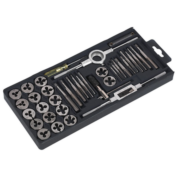 Contents:Taps & Dies; 3 x 0.5, 3 x 0.6, 4 x 0.7, 4 x 0.75, 5 x 0.8, 5 x 0.9, 6 x 0.75, 6 x 1, 7 x 0.75, 7 x 1, 8 x 1, 8 x 1.25, 10 x 1.25, 10 x 1.5, 12 x 1.5, 12 x 1.75mm, 1/8"NPT, Tap Wrench, T-Bar Tap Wrench, Die Holder, Thread Gauge, Screwdriver