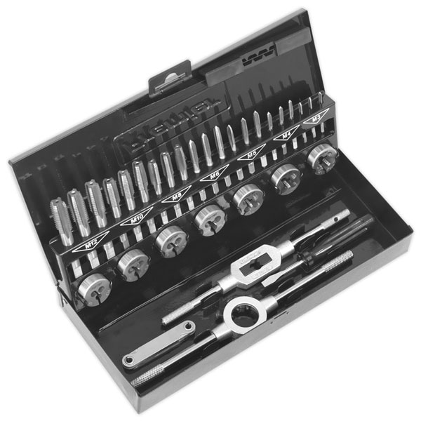 M3 to M12 steel tap and die set manufactured from HSS 4341 steel providing improved cutting performance and longevity. Split dies with machined lead-ins for ease of use. Taps supplied in three types for each size, taper (starting), second tap (intermediate) and plug (bottoming); matched by equivalent sized dies. Provides all functions required for a professional engineer. Set includes tap wrench, steel die handle, screw pitch gauge and screwdriver. Supplied in metal case.