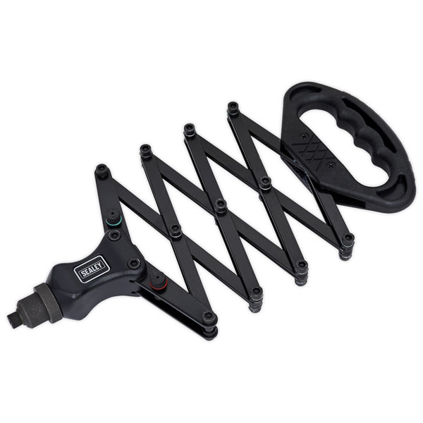 Aluminium head with steel jaw case and 3-piece jaws for blind aluminium, steel and stainless steel rivets. Suitable for repetitive riveting tasks. Knurled nozzles for quick changing. Supplied with five nozzles.