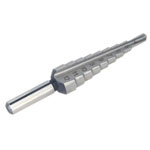 High speed steel double flute step drills. Allows clog-free, precision drilling of up to fourteen different size holes with just one bit. Supplied in sliding tube.