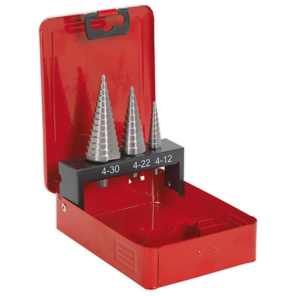Three high-speed HSS M2 double flute step drills. Double straight flutes for efficient swarf clearance. Allows clog-free, precision drilling of eighteen different size holes with just three bits. Supplied in a flip-up metal case.