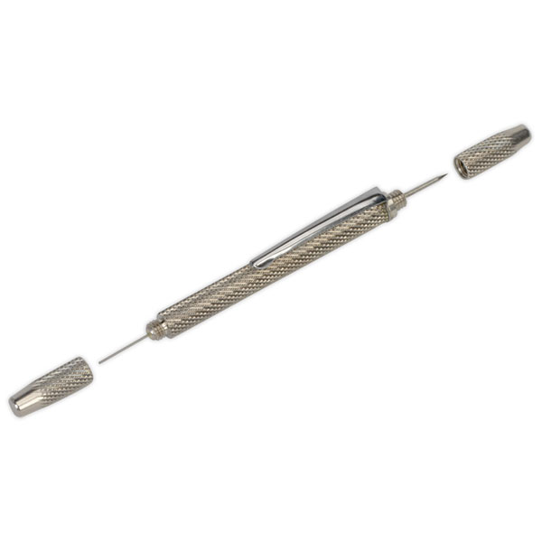 Compact, double end tool with pocket clip. Screwed caps house a pointed scribe for cleaning and clearing washer jets at one end and finer probe for adjusting position of jets at the other. Heavily knurled body for sure handling.