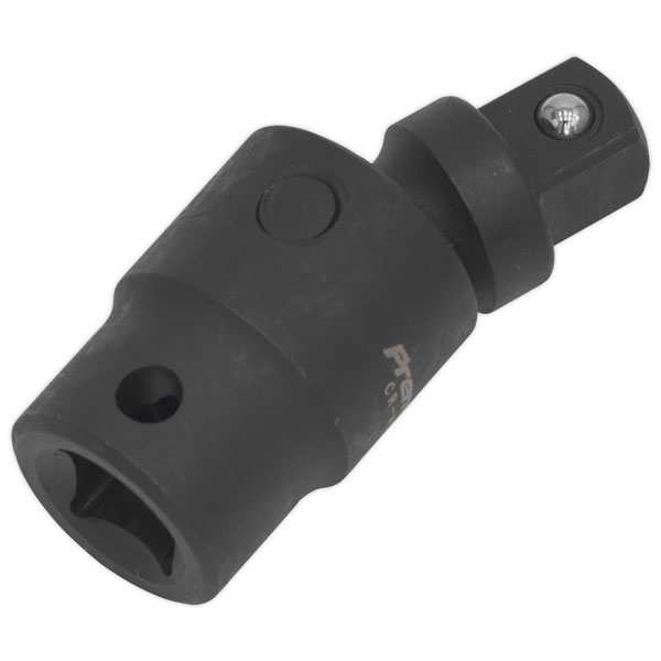 Drop-forged steel universal joint. Suitable for use on all types of air impact tool. Chrome Vanadium steel with phosphate finish for added corrosion resistance. Spring-ball socket retainer and drilled head to accept retaining pin.