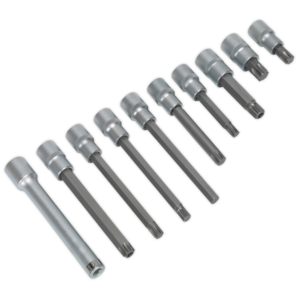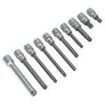 Head bolt removal tools with long reach suitable for modern engines. Nine drop-forged Chrome Vanadium steel sockets with S2 steel male bits, and one single piece Chrome Vanadium TRX-Star* deep socket. Sockets heat treated and chrome plated with satin finish for resistance to corrosion. Knurled ring on sockets to assist gripping with oily fingers. Suitable for BMW, Fiat, Ford, Mazda, Mercedes, Nissan, Renault, Rover and VAG vehicles. Supplied in storage case.