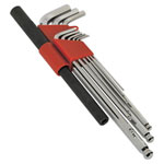 Keys manufactured from hardened and tempered Chrome Vanadium steel with a fully polished mirror finish. Ball-end allow key to drive fixing at up to 30°. Keys range in length from 90mm to 235mm and in size from 1.5mm to 10mm. Set includes double end power bar to aid comfort whilst driving stubborn fixings. Supplied with storage clip.