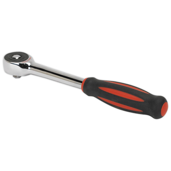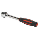 Dual action push-through reverse ratchet wrench. Twisting the handle backwards and forwards rotates the drive in one direction allowing for use where space is at a premium. Can also be used as a regular ratchet. Fitted with a soft grip handle for comfort and control.