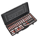 This 45-piece socket set from Sealey features a series of professional, heat treated, chrome vanadium steel WallDrive® sockets. Fully polished micro satin finish. Flip reverse gear-to-gear ratchet with quick socket release.