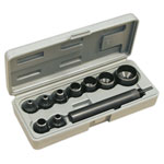 Carbon steel body with spring loaded centring pin. Suitable for cutting gasket material, cork or leather. Supplied in storage case with nine dies.