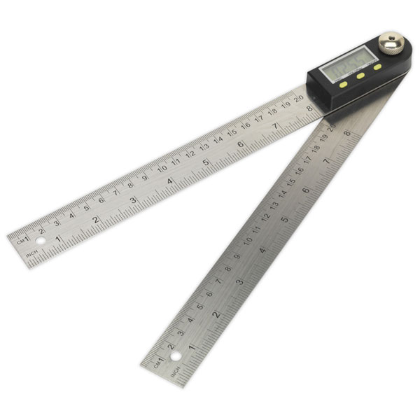 Indispensable tool ideal for woodworking, construction and machining. An angle finder that doubles as a rule, designed to find both internal and external angles. The digital display is clear with easy calibration. Measuring range from 0° to 360° with Metric/Imperial rule which can be locked in any position.