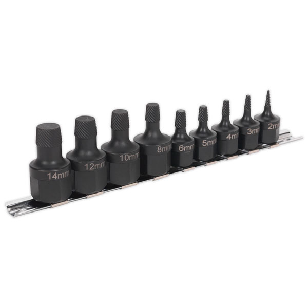 Suitable for the removal of broken studs and bolts. Left-hand tapered spiral design, tightens into pre-drilled stud/bolt as more torque is applied. Supplied on socket rail.