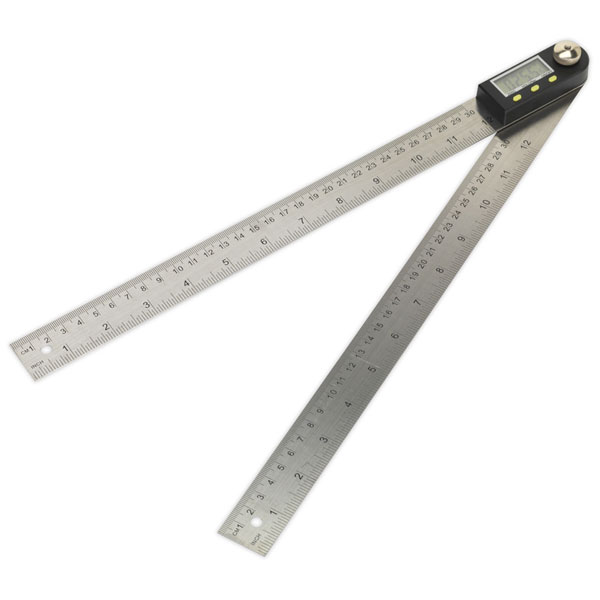 Indispensable tool ideal for woodworking, construction and machining. An angle finder that doubles as a rule, designed to find both internal and external angles. The digital display is clear with easy calibration. Measuring range from 0° to 360° with Metric/Imperial rule which can be locked in any position.