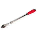 Manufactured from Chrome Vanadium steel. Hardened and tempered with a chrome plated mirror finish. 36-Tooth ratchet needs only 10° rotation to engage next tooth. 180° Flexible head with 3-position control ring gives anticlockwise/clockwise ratchet and locked. Extension retained at set increments with a quick release locking ring giving different shaft lengths. Soft grip handle for added comfort and fully replaceable ratchet knuckle joint*.