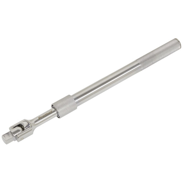 Hardened and tempered Chrome Vanadium steel breaker bar with a fully polished mirror finish. Handle extension retained at set increments with a quick release locking ring giving three different shaft lengths from 540-800mm. Spring loaded socket retention. Fully replaceable knuckle joint*.