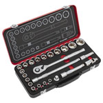 Professional socket set with heat treated Chrome Vanadium steel sockets and accessories.
