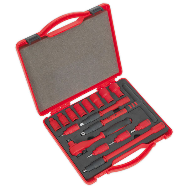 Hardened and tempered Chrome Vanadium steel sockets and accessories. Chrome plated for resistance to corrosion. Each component is fully insulated to VDE and EN 60900 standards to protect from electric shocks up to 1500V DC and 1000V AC. Ideal for technicians working on modern hybrid and electrical vehicles (1500V DC safe live working). Also suitable for electricians and carpenters (1000V AC safe live working). Supplied in storage case.