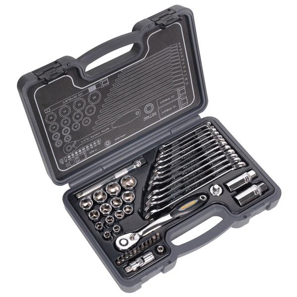Heat treated, drop-forged Chrome Vanadium steel socket and spanner set with a fully polished mirror finish. Sockets cover sizes from 8 to 22mm and spanners from 8 to 19mm. Includes 72-tooth gear-to-gear flip reverse comfort grip ratchet handle with push button quick release, 150mm extension bar, universal joint, driver bits, T-bar adaptor and spark plug sockets. Supplied in carry-case.