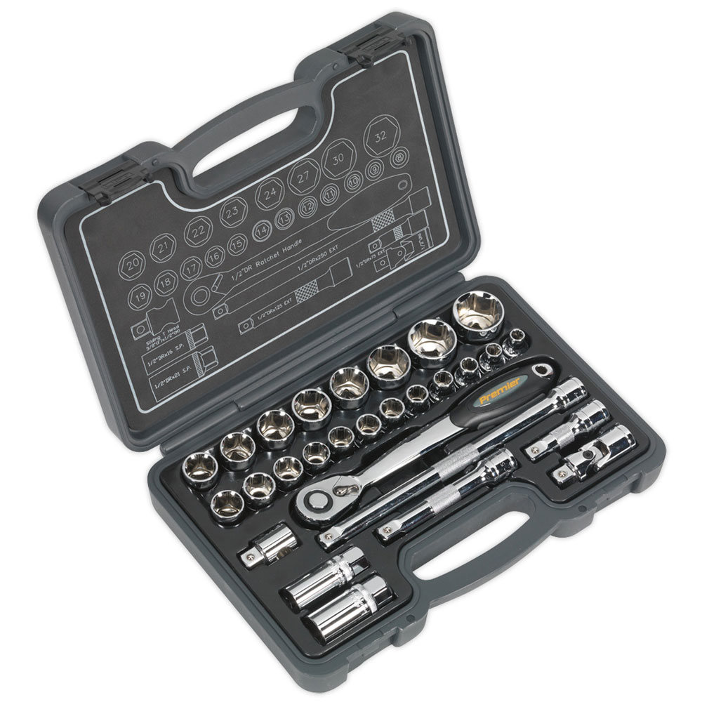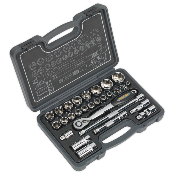 Heat treated, drop-forged Chrome Vanadium steel sockets and accessories with a fully polished mirror finish. Covers sizes from 8 to 32mm. Features 72-tooth gear-to-gear flip reverse comfort grip ratchet wrench with push-button quick release, extension bars, spark plug sockets, universal joint and T-bar adaptor. Includes contents map displayed inside the lid. Supplied in storage case.
