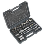 | Contents: | Sockets; 8, 9, 10, 11, 12, 13, 14, 15, 16, 17, 18, 19, 20, 21, 22, 23, 24, 27, 30, 32mm, Spark Plug Sockets; 16, 21mm, Extension Bars; 75, 125, 250mm, 1/2"Sq Drive 72-Tooth Flip Reverse Ratchet Wrench with Quick Release, Universal Joint, 3/8"Sq Drive - 1/2"Sq Drive Male Adaptor |