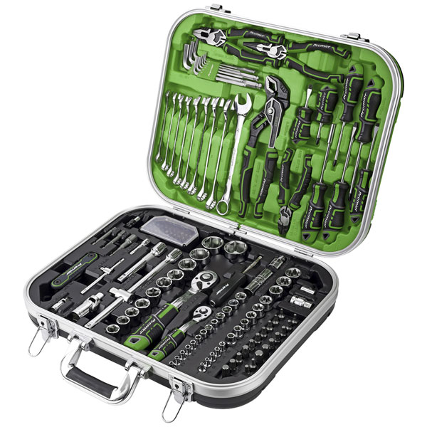 Includes 1/4"", 3/8"" and 1/2""Sq drive sockets, hex keys, spanners, screwdrivers, pliers, bits and accessories.