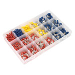 Comprehensive set of electrical terminals suitable for automotive applications. Features the most popular sizes of male and female spade, butt, fork and ring insulated crimping terminals. Supplied in partitioned case.