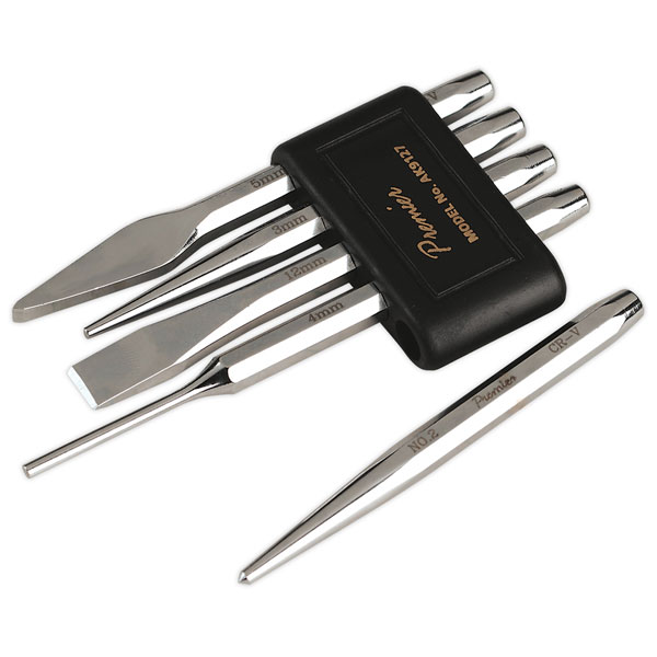 Contents:#2 x 9.5 x 120mm Centre Punch, Ø3 x 9.5 x 120mm Taper Pin Punch, Ø4 x 9.5 x 150mm Parallel Pin Punch, 12 x 9.5 x 130mm Cold Chisel, 5 x 9.5 x 130mm Utility Chisel