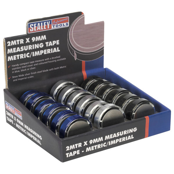 Handy compact tape measure with a brushed stainless steel cover and coloured housing available in blue, silver or black. 9mm Wide silver finish steel blade with both Metric and Imperial scales. Packed in multiples of 18 tapes, 6pcs of each colour in a countertop display.